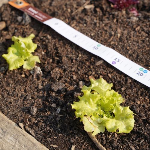 Sedaj lahko točno sledite priporočenim sadilnim razdaljam za posamezno rastlino. Glavna posebnost vrtnega metra je, da so s krogi že označene tipične razdalje med vrtninami. Z rinkami ga enostavno napnemo čez gredo. Tako nam pomaga držati ravno linijo za pripravo plitkega jarka za setev. Delo setve lahko z njegovo pomočjo približamo otrokom.